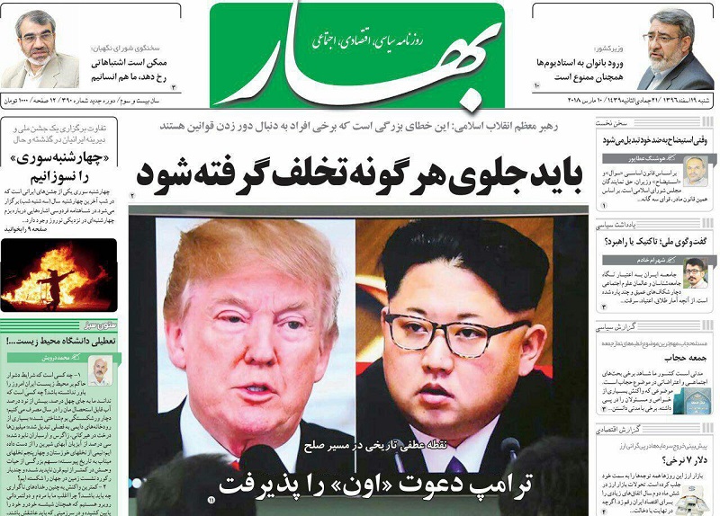 روزنامهی اطلاعات به دیدار احتمالی رهبران کره شمالی و ایالات متحده پرداخته است: یکباره در واشنگتن اعلام شد، «ترامپ» تا پایان ماه مه، (اردیبهشت ماه) آینده، با «اون» رئیسجمهوری کرهشمالی ملاقات و گفتگوی دوجانبه خواهد داشت. چانگاییون، مشاور امنیت ملی کرهجنوبی که همراه رئیسجمهوری این کشور از کرهشمالی دیدار کرد و در گفتگوی دو رئیس جمهوری کره هم حضور داشت، پیام دعوت رهبر کرهشمالی را به واشنگتن برد و بعد از ملاقات با ترامپ در سخنانی در کاخ سفید اعلام کرد که ترامپ پذیرفته است با رهبر کرهشمالی دیدار کند تا درباره خلع سلاح هستهای شبهجزیره کره به گفتگو بپردازد. رئیسجمهوری کرهشمالی همچنین قبول کرده است تا زمان دیدار با ترامپ، آزمایشهای موشکی در کشورش را متوقف کند. رئیسجمهوری آمریکا هم در توییتر خود با استقبال از دعوت و دیدار مستقیم با رهبر کرهشمالی نوشت: «از این پیشرفت استقبال میکنم، اما تا حصول نتیجه، تحریمهای کرهشمالی برقرار خواهد بود.»