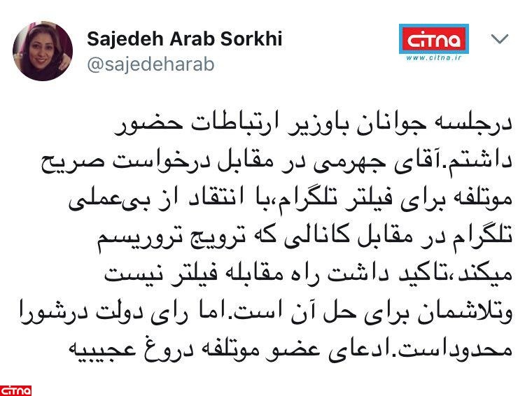 به گزارش سیتنا، پس از دیدار چند روز پیش وزیر ارتباطات و فناوری اطلاعات با اعضای شاخه جوانان برخی احزاب سیاسی، یکی از رسانهها با نقل قول از یک عضو جوان حزب موتلفهی حاضر در این جلسه، نوشت که وزیر ارتباطات در این جلسه گفته است ” تلگرام حامی تروریسم است؛ با فیلترینگ آن موافقم.”