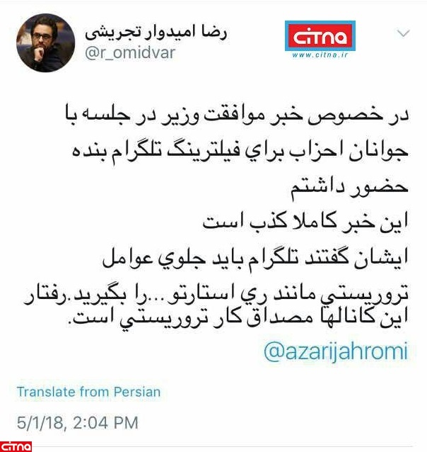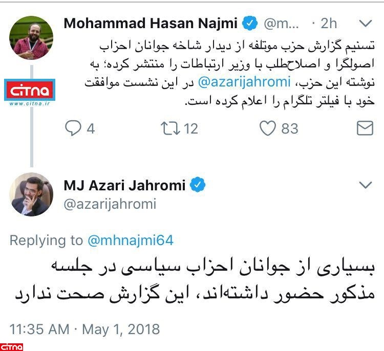 رضا امیدوار تجریشی هم که از حزب اعتماد ملی در این جلسه حضور داشته ضمن رد ادعای موافقت آذری جهرمی با فیلترینگ تلگرام، توئیت کرد: در خصوص خبر موافقت وزیر با فیلترینگ تلگرام در جلسه با جوانان احزاب، بنده هم حضور داشتم. این خبر کاملا کذب است. ایشان گفتند که تلگرام باید جلوی عوامل تروریستی مانند ری استارت و … را بگیرد. رفتار این کانال ها مصداق کار تروریستی است.