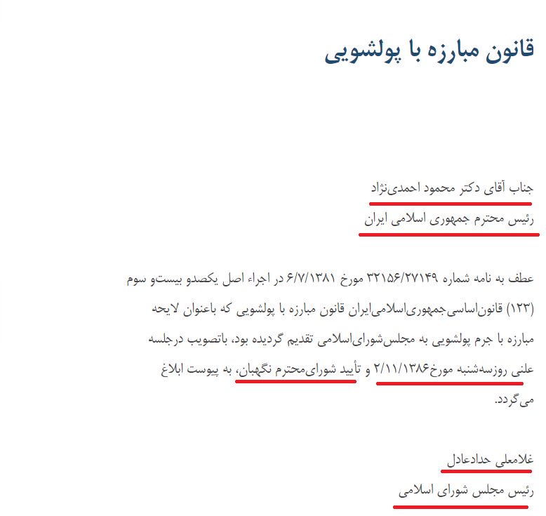 لذا در دولت احمدی نژاد و زیر نظر دادستانی و وزارت اطلاعات وقت، “لایحه” مربوط به پولشویی (AML) تهیه و در سال ۸۶ به تصویب مجلس و شورای نگهبان رسید. یعنی یکی از دو الزام اصلی FATF در دولت انقلابی احمدی نژاد تهیه و توسط مجلس انقلابی و اصولگرا تصویب و توسط شورای بصیر نگهبان تایید شد!
