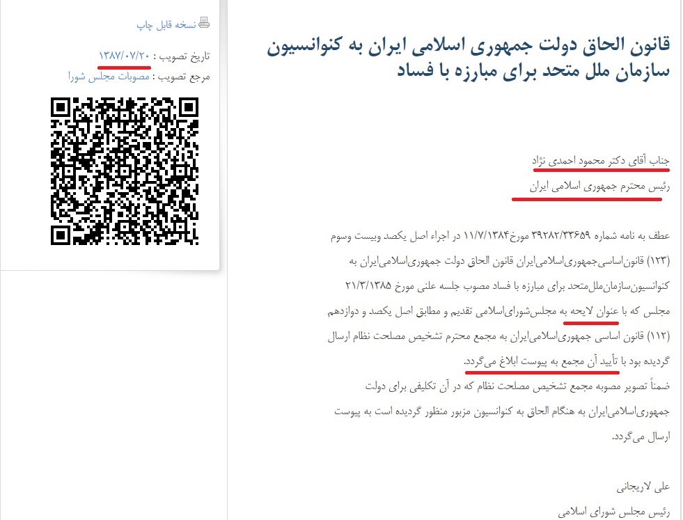 علاوه بر آن در سال ۸۷ نیز “لایحه” الحاق ایران به کنوانسیون سازمان ملل متحد براى مبارزه با فساد که در راستای اقدامات لازم جهت تعدیل گزارشات FATF بود توسط دولت انقلابی احمدینژاد تهیه، توسط مجلس انقلابی و اصولگرا تصویب و توسط مجمع تشخیص (بخاطر اختلاف مجلس و شورای نگهبان) تایید شد!