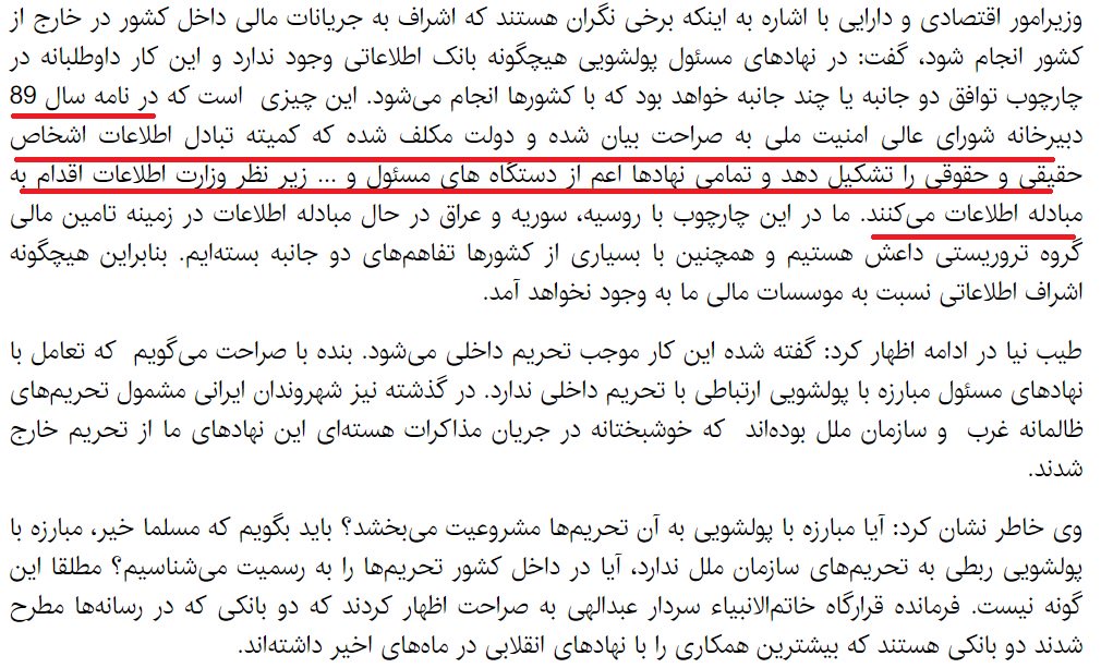 ۳- با توجه به تشدید مشکلات بانکی ناشی از تحریم و گزارشهای FATF، در سال ۱۳۸۸، دبیرخانه شورای امنیت ملی وقت و شخص آقای جلیلی، دیپلمات انقلابی، دولت را “مکلف” نمود که با FATF “تعامل برقرار کرده و الزامات آنها را رعایت نماید”. همچنین دولت مکلف به تبادل اطلاعاتی در این زمینه شد!