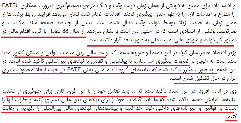 همچنین این وزیر دولت انقلابی احمدینژاد، طی یک نامه به رییس مجلس درخواست تسریع در تصویب قوانین و الزامات FATF را میکند یعنی همان کاری که در مجلس الان و دولت فعلی در حال انجام بود اما خیانت خوانده شد!