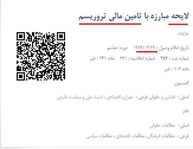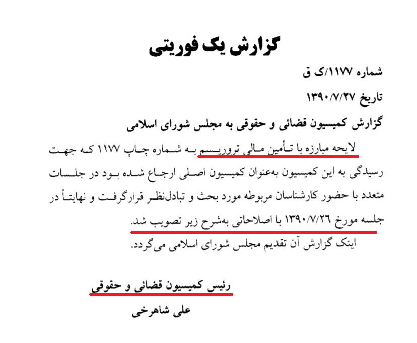 در نهایت “قانون مبارزه با تامین مالی تروریسم” که توسط دولت احمدینژاد تهیه شده بود در سال ۹۴ به تصویب مجلس و تایید شورای نگهبان رسید.