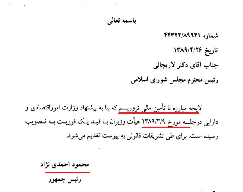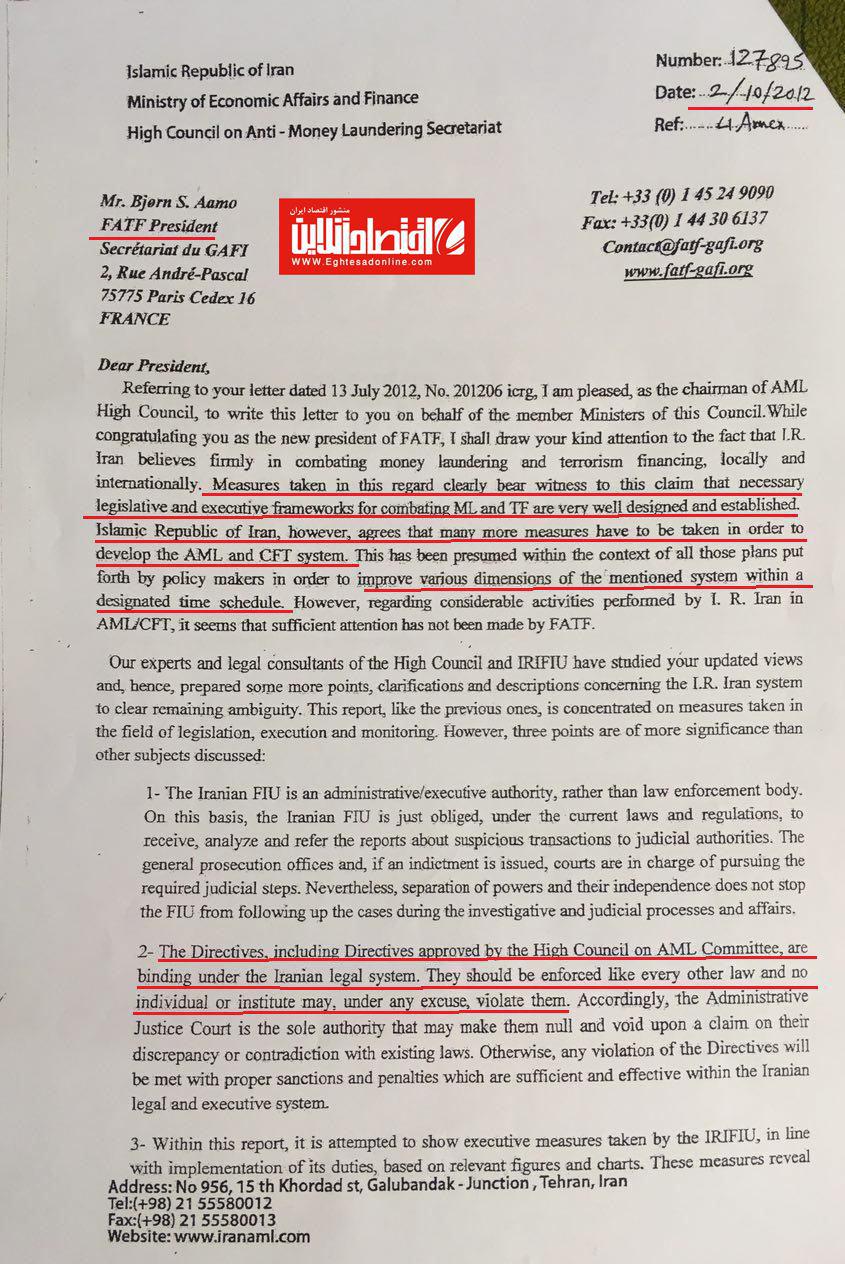 ۵- اما از همه مهمتر و […] بارتر، نامه وزیر اقتصاد دولت احمدینژاد به FATF است که در آن تعهد تصویب، گرفتن تایید از شورای نگهبان و اجرای بدون کم و کاست الزامات این گروه را میدهد.