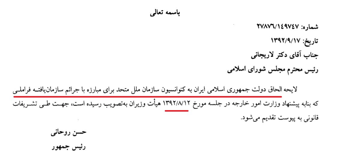 همچنین لایحه الحاق ایران به پالرمو که در دولت احمدینژاد تهیه شده بود در آذر ۹۲ به مجلس ارسال و پس از کش و قوسهای زیاد در خرداد ۹۷ تصویب شد!