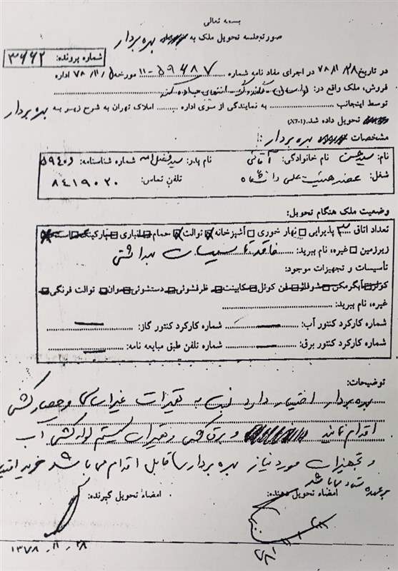 بدینوسیله سند تحویل محلی در لواسان ابتدای جاده کُند را که به دستور مقام معظم رهبری به اینجانب تحویل شده است برای اطلاع ملت شریف ایران منتشر میکنم.