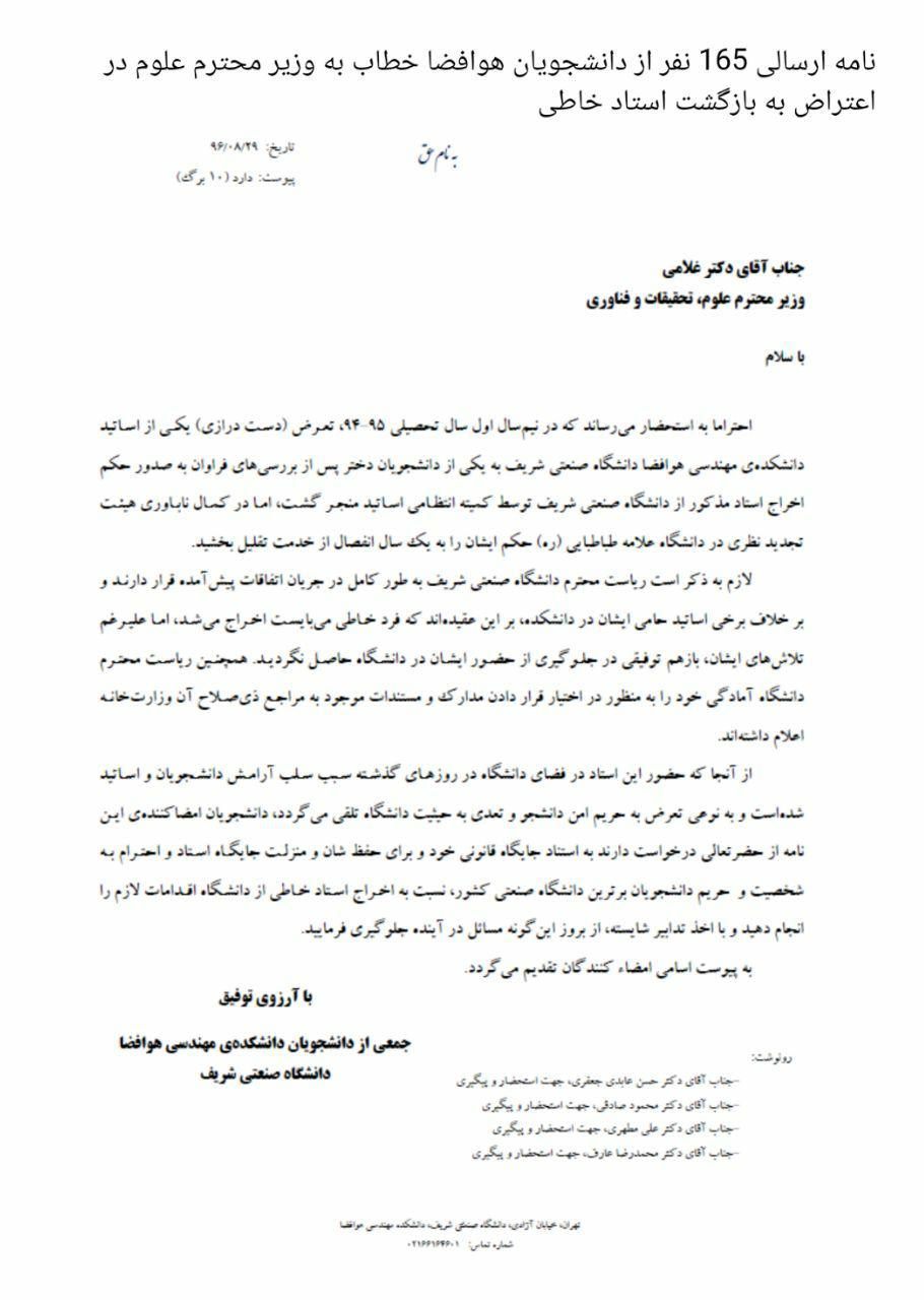 از آنجا که حضور این استاد در فضای دانشگاه در روزهای گذشته سبب سلب آرامش دانشجویان و اساتید شده است و به نوعی تعرض به حریم امن دانشجو و تعدی به حیثیت دانشگاه تلقی می گردد، دانشجویان امضا کننده این نامه از حضرتعالی درخواست دارند به استناد جایگاه قانونی خود برای حفظ شان و منزلت جایگاه استاد و احترام به شخصیت و حریم دانشجویان برترین دانشگاه صنعتی کشور نسبت به اخراج استاد خاطی از دانشگاه اقدامات لازم را انجام دهید و با اخذ تدابیر شایسته از بروز این گونه مسائل در آینده جلوگیری فرمایید.»