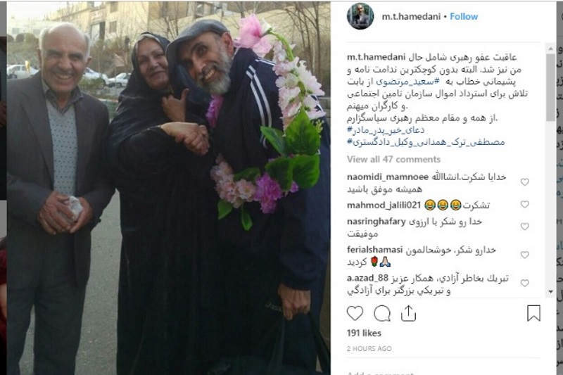ترک همدانی با انتشار عکسی از خود و پدر و مادرش پس از آزادی از زندان در اینستاگرام نوشت: «عاقبت عفو رهبری شامل حال من نیز شد. البته بدون کوچکترین ندامت نامه و پشیمانی خطاب به #سعید_مرتضوی از بابت تلاش برای استرداد اموال سازمان تامین اجتماعی و کارگران میهنم.