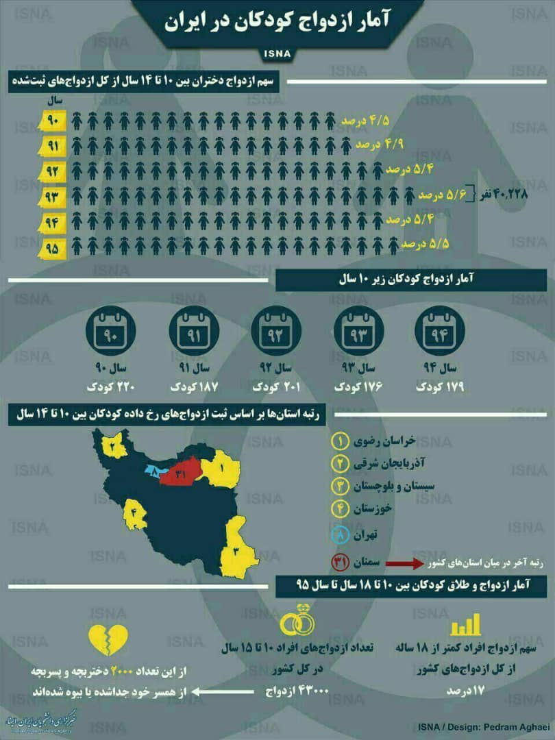 طبق آمار ثبت احوال که در ایسنا منتشر شده بود، ۲۸ دختر کمتر از ۱۰ سال و ۳۱۷ پسر کمتر از ۱۵ سال در سال ۹۶ ازدواج کردهاند. در همین سال بیش از ۵۴ هزار مورد ازدواج دختران بین ۱۰ تا ۱۴ سال و پسران بین ۱۵ تا ۱۹ سال در کشور ثبت شده است. فقط در استان تهران در سال گذشته، ۱۴۸۱ ازدواج زیر ۱۵ سال به ثبت رسیده که ۱۴۶۳ مورد آن ازدواج دختران زیر ۱۵ ساله بود. همچنین طبق آمار تا سال ۹۵ آمار ازدواجهای کمتر از ۱۸ سال در کشور ۱۷ درصد بوده است.