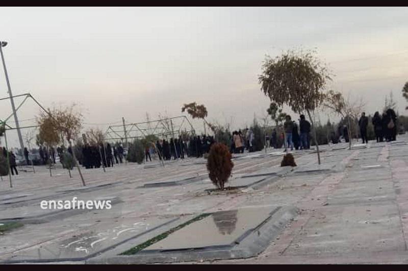 روبهروی قطعهی ۲۸ و در انتهای قطعهی ۳۰ افرادی ایستادهاند که بیشترشان ماسکی به صورت زدهاند. دقیقا روبهروی آنها نیروهای پلیس ایستادهاند. کسی حرفی نمیزند و همه چیز در سکوت ادامه دارد. بعد از چند دقیقه صدای اللهاکبر میآید و یک خانوادهی عزادار پیکری را برای خاکسپاری میبرند؛ بعد از رفتن آنها و وقتی حواس همه به این افراد بود زنی فریاد زد: «دست بزنید.» جمعیت دست زد و متمرکز شد. افرادی هم که دورتر ایستاده بودند هم به آنها پیوستند و جمعیت آنها به حدود صد تا صدو پنجاه نفر رسید. زنی دوباره فریاد زد: «نیروی انتظامی، حمایت حمایت»