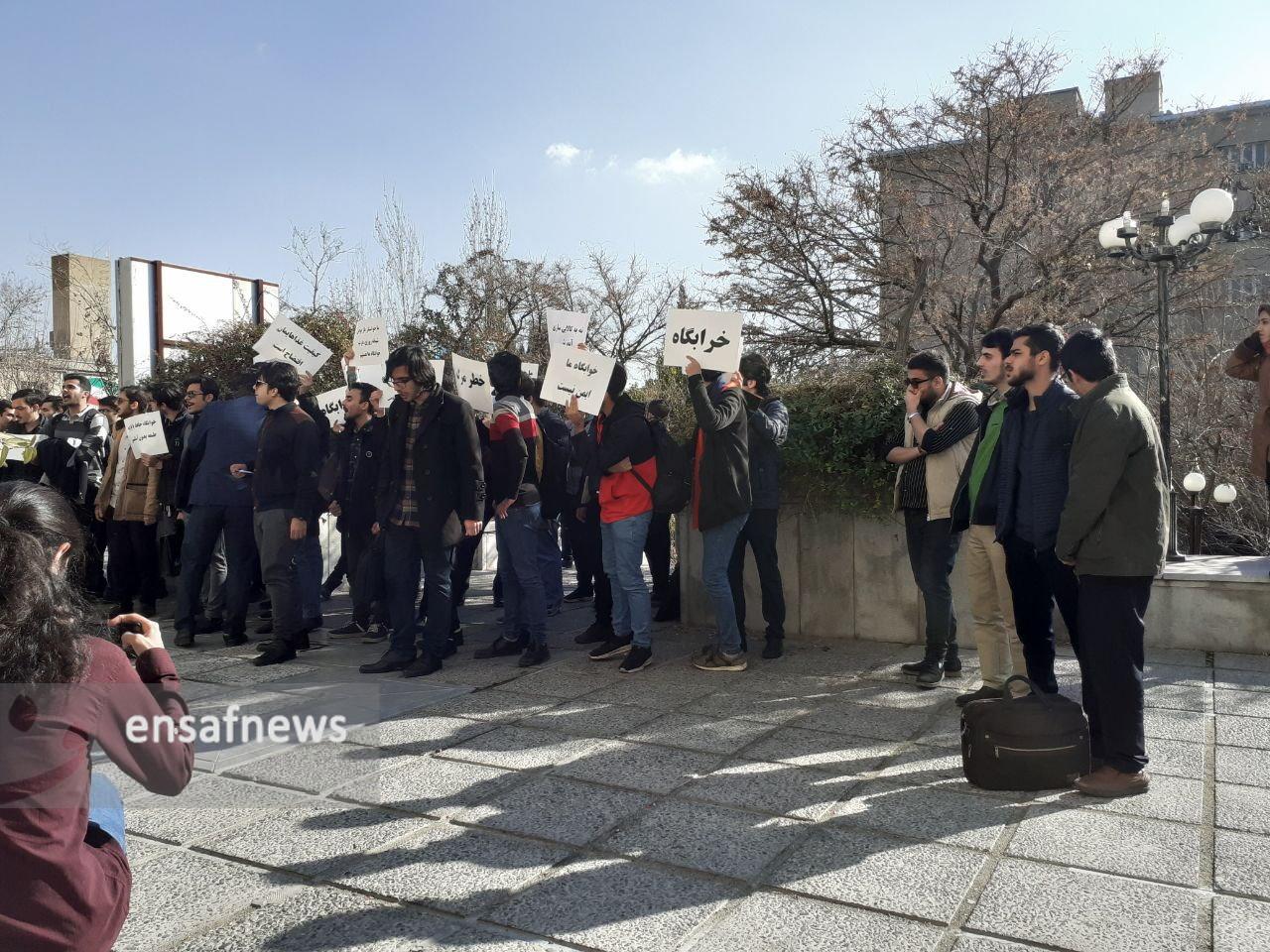 به گزارش خبرنگار انصاف نیوز، این دانشجویان خوابگاهی شعارهایی را سر میدانند از جمله «خواسته ما صنفیه / بی قانونی کافیه»، «بودجهی دانشگاهی شفاف باید گردد»، «دانشجوی شهرستان خوابگاش شده قبرستان»، «از خوابگاه مونده دیوار/ اونم خراب شده این بار»، «مدیر بیکفایت/ استعفا استعفا»، «رییس بی کفایت / انفصال انفصال»، «دانشگاه بنگاه شده / کاسبی از ما شده»، «سیاست دانشگاه خرید املاک شده»، «بوی بد فاضلاب / خوابگاه شده منجلاب»، «دانشجو کار کنه، دانشگاه پول چاپ کنه»، «حبیبا بیا پایین ما که کاریت نداریم»، «دانشجو میمیرد/ ذلت نمیپذیرد»، «صدای ما مظلومان استفعای مسوولان».
