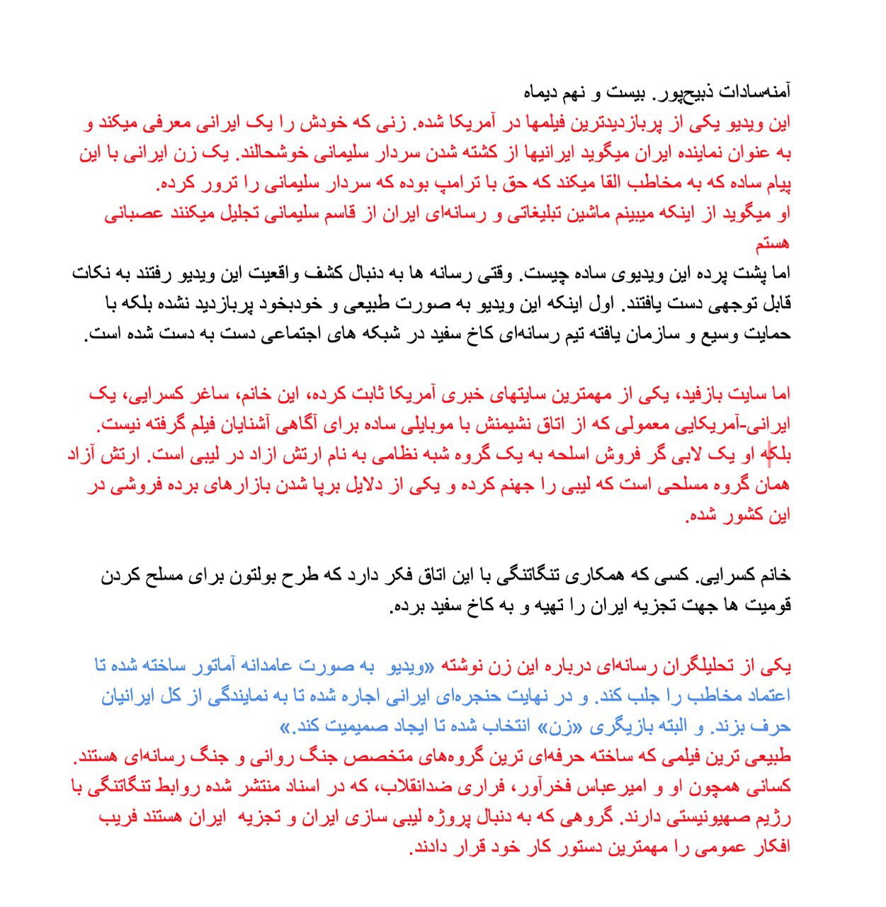 آمنه سادات ذبیح پور در توییتی در واکنش به او نوشت: «فردی ساکن لندن مدعی شده گزارش دیشب بیست و سی به نام واقعیت یک ویدئو، کپی برداری و دزدی از متن کانال او بوده و بعد هم تهمت های ناروایی زده است که البته اولین بارش نیست. گزارش را یکبار دیگر ببینید. چندثانیه مربوط به متن شما است و در آن گفته شده که نظر یک تحلیل گررسانه این است».