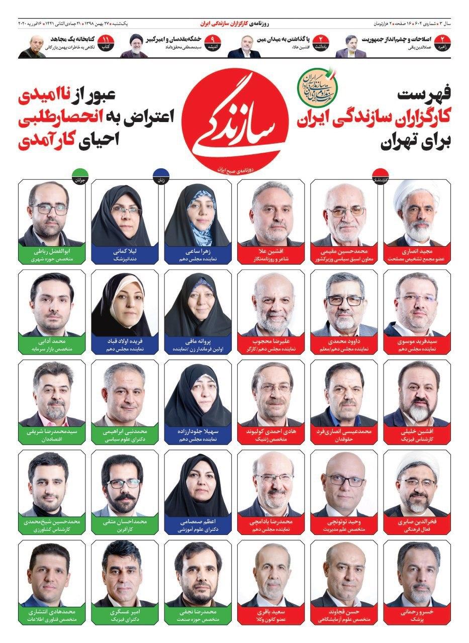 لیست چند حزب اصلاح طلب: مجید انصاری عضو مجمع روحانیون مبارز، ۲. مصطفی کواکبیان دبیرکل حزب مردمسالاری، ۳. علیرضا محجوب دبیرکل خانه کارگر، ۴. داوود محمدی دبیرکل انجمن اسلامی معلمان، ۵. محمدحسین مقیمی از مدیران باسابقه دوران اصلاحات، ۶. محمدرضا راه چمنی دبیرکل حزب وحدت و همکاری ملی، ۷. علی داستانی عضو شورای مرکزی حزب همبستگی، ۸. سهیلا جلودارزاده عضو شورای مرکزی خانه کارگر، ۹. امیر عسگری عضو مجمع فرهنگیان ایران اسلامی، ۱۰. افشین علا از فعالان فرهنگی اصلاح طلب، ۱۱. پروانه مافی عضو شورای مرکزی حزب کارگزاران، ۱۲. اعظم صمصامی عضو مجمع فرهنگیان ایران اسلامی، ۱۳. سعید باقری حقوقدان، ۱۴. محمدرضا بادامچی عضو شورای مرکزی حزب اسلامی کار، ۱۵. محمدهادی انتشاری از جوانان فعال اصلاحطلب، ۱۶. فریده اولادقباد نماینده فعلی مجلس، ۱۷. فخرالدین صابری از نمایندگان اصلاحطلب ادوار مجلس، ۱۸. محمدرضا شریفی اقتصاددان و از اساتید دانشگاه تهران، ۱۹. زهرا ساعی از شورای مرکزی حزب اعتدال و توسعه و عضو خانه کارگر،۲۰. محمدعلی وکیلی مدیرمسئول روزنامه ابتکار، ۲۱. سید فرید موسوی عضو حزب اتحاد ملت، ۲۲. محسن علیجانی پزشک و نماینده فعلی مجلس، ۲۳. محمدرضا نجفی نماینده فعلی مجلس، ۲۴. محمدحسین شیخمحمدی معاون سیاسی حزب ندا، ۲۵. وحید توتونچی عضو حزب ندا، ۲۶. حسن انصاری فعالان سیاسی اصلاحطلب و عضو حزب ازادی، ۲۷. علیحسین رضاییان عضو شورای مرکزی انجمن مدرسین دانشگاهها، ۲۸. ابوالفضل سروش نماینده فعلی مجلس، ۲۹. حبیب سهرابی پارسا از فعالان اصلاحطلب، ۳۰. مهدی شیخ فعال سیاسی اصلاحطلب
