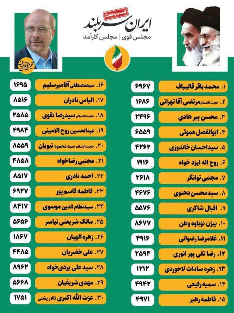 ائتلاف اصولگرایان به سرلیستی قالیباف: محمدباقر قالیباف، مرتضی آقاتهرانی، سیدمصطفی میرسلیم، زهره الهیان، محسن پیرهادی، فاطمه رهبر، بیژن نوباوه، سمیه رفیعی، سیدمحمود نبویان، فاطمه قاسمپور، الیاس نادران، زهره لاجوردی، سیدرضا تقوی، رضا تقیپور، غلامحسین رضوانی، سیدمحسن دهنوی، سیدنظامالدین موسوی، علی خضریان، مالک شریعتی، روحالله ایزدخواه، مجتبی توانگر، مجتبی رضاخواه، مهدی شریفیان، سیداحسان خاندوزی، ابوالفضل عمویی، احمد نادری، اقبال شاکری، عبدالحسین روحالامینی، عزتالله اکبری تالارپشتی و سیدعلی یزدیخواه.