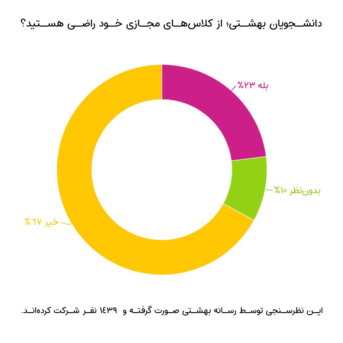 دانشگاه بهشتی با توجه به اینکه در شرایط عادی نیز، دانشجوی مجازی دارد؛ از اولین دانشگاههایی بود که کلاسهای خود را مجازی کرد اما این موضوع نارضایتی بخش بزرگی از دانشجوها را به همراه داشت. طی نظرسنجیای که از ۱۴۳۹ نفر از دانشجوهای بهشتی انجام دادیم؛ فقط ۲۳% آنها از کیفیت کلاسهای مجازی راضی بودند. بهتر است دانشگاه بهشتی را به دو بخش کلی تقسیم کنیم؛ بخش اول رشتههای فنی مهندسی و علوم پایه و بخش دوم رشتههای علوم انسانی. دانشجوهایی که دارای درسهای محاسباتی و ارتباطمحور هستند، کیفیت کلاسها را پایینتر ارزیابی کردند؛ در واقع اکثریت دانشجوهای فنی مهندسی شیوهی مجازی را کارا نمیدیدند. اما رشتههای علوم انسانی مثل ادبیات، روانشناسی و… با توجه به محاسباتی نبودن درسها درصد رضایت بالاتر است.