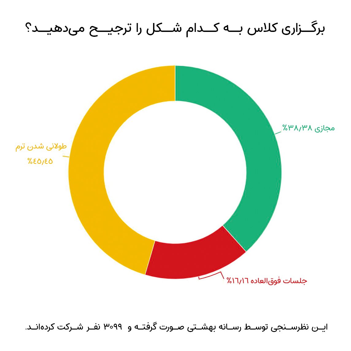 طبق نظرسنجی دیگری که از ۳۰۹۹ نفر دانشجو صورت گرفت، ۴۵% طولانی شدن ترم، ۳۸% کلاسهای مجازی و ۱۶% پس از عادی شدن شرایط، به صورت جلسات فوق العاده را در این شرایط ترجیح میدادند.