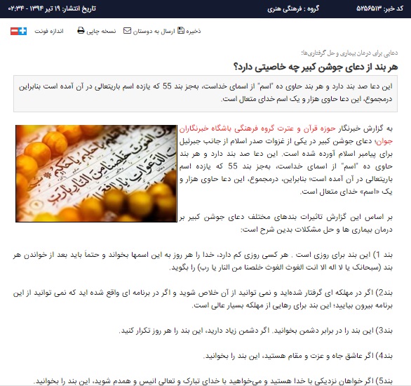 باشگاه خبرنگاران جوان در گزارشی ادعا کرد که دعای جوشن کبیر در یکی از غزوات صدر اسلام توسط جبرئیل برای پیامبر آورده شده و همچنین در این گزارش برای هریک از فرازهای این دعا تاثیراتی چون درمان دردهای جسمی از جمله دندان درد و کمر درد و کارهایی مثل خرید خانه و رفع مشکلات در ادارات و… برشمرده است، موضوعی که علی اشرف فتحی -مدرس حوزه و پژوهشگر در زمینههای مطالعات شیعه، حوزه و روحانیت- با رد صریح آن میگوید که دعای جوشن کبیر از دعاهای معتبر نبوده و سند آن ایراداتی جدی دارد و باید در انتساب آن به معصومین محتاط بود.