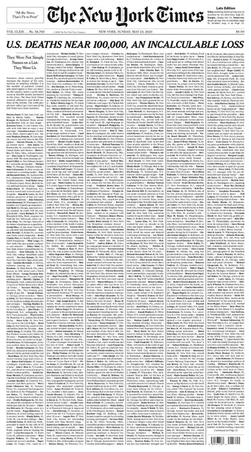 با رسیدن شمار جانباختگان ویروس کرونا در آمریکا به صد هزار نفر، روزنامه نیویورک تایمز در صفحه نخست جدیدترین شماره خود طرحی شامل آگهی مرگ هزار قربانی این ویروس قرار داد.