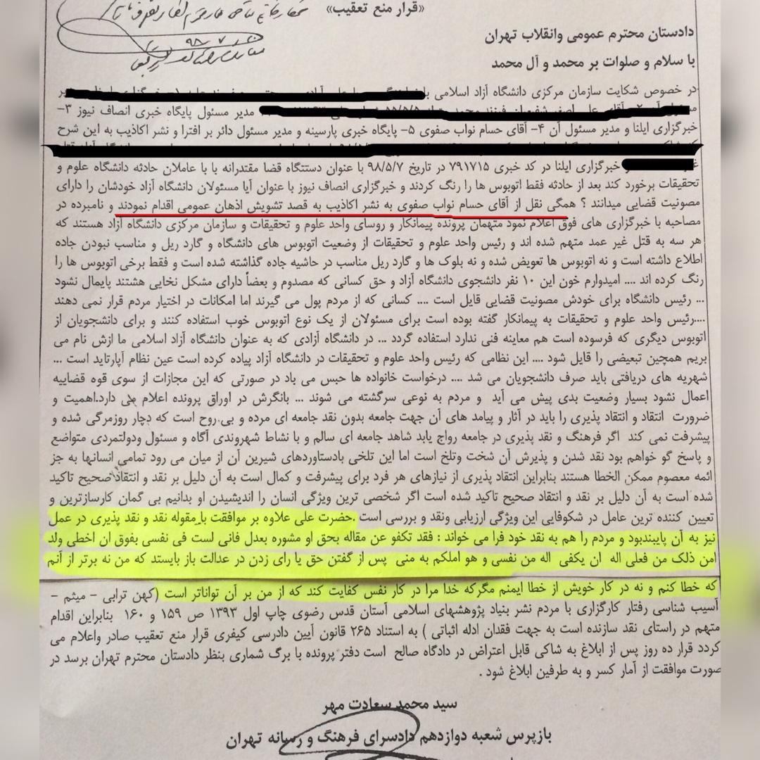 هموطنان عزیزم، به اطلاع می‌رساند شکایت سازمان مرکزی دانشگاه آزاد اسلامی از اینجانب و تعدادی از خبرگزاری‌های کشورم [ایلنا، ایرنا، انصاف نیوز، پارسینه] به اتهام افترا، تشویش اذهان عمومی و نشر اکاذیب در حادثه اتوبوس علوم و تحقیقات که قرار منع تعقیب آن توسط بازپرس محترم شعبه دوازدهم داسرای فرهنگ و رسانه صادر شده بود و با اعتراض دانشگاه آزاد به دادگاه ارجاع گشت و مجدداً توسط شعبه ششم دادگاه کیفری یک، تأیید و بنابراین حکم منع تعقیب قطعی است.