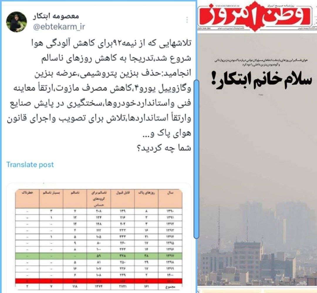 حالا که آلودگی هوای تهران به مرز هشدار رسیده، معصومه ابتکار نیز در صفحه شخصی خود نوشت: «تلاش‌هایی که از نیمه سال ۹۲ برای کاهش آلودگی هوا شروع شد، تدریجا به کاهش روزهای ناسالم انجامید. حذف بنزین پتروشیمی، عرضه بنزین و گازوییل یورو۴، کاهش مصرف مازوت، ارتقا معاینه فنی و استاندارد خودروها، سخت گیری در پایش صنایع و ارتقا استانداردهای صنایع، تلاش برای تصویب و اجرای قانون هوای پاک و…شما چه کردید؟»