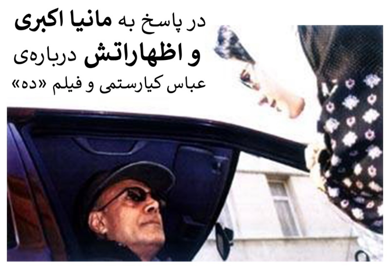 «عباس عزیز و نازنین» این شروع متن ایمیلیست از مانیا اکبری به عباس کیارستمی، همراه با عکسی که در آن اکبری از روی تخت بیمارستان (هنگامی که در حال گذراندن دورهی بازسازی سینههایش بوده) سلامی مخصوص خطاب به کیارستمی میفرستد. تاریخ ایمیل مربوط است به ژوئن ۲۰۱۶، یک ماه پیش از مرگ عباس کیارستمی و تنها یکی از دهها ایمیل دوستانهایست که او در طول سالها برای کیارستمی فرستاده است. اینکه در این فاصلهای چهار ساله، چه اتفاقی افتاده که موضع خانم فیلمساز دچار تغییر ۱۸۰ درجهای شده، بهطوریکه کیارستمی را در زمرهی آزارگران و متجاوزان جنسی قرار میدهد، بر ما پوشیده است، اما اظهارات ضد و نقیص او چیز جدیدی نیست. مانیا اکبری با بازی در فیلم «ده»ِ کیارستمی (محصول ۲۰۰۲) به شهرت رسید، فیلمی که بر اساس شخصیت واقعی اکبری شکل گرفته است. او که همان سال با «ده» و به همراه کارگردان فیلم در بخش مسابقهی جشنوارهی فیلم کن حضور داشت، چند سال بعد مدعی شد که ایدهی این فیلم از او بوده است. بعد از درگذشت کیارستمی، خانم اکبری در یک برنامهی تلویزیونی بهعنوان میهمان حضور پیدا میکند و درحالیکه در فقدان کیارستمی اشک میریزد، از او به نیکی یاد میکند.