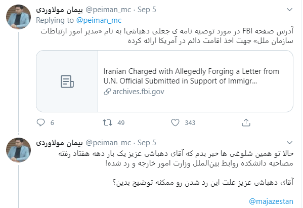 جهت اطلاع: صفحه ای در سایت FBI آمریکا موجود است که ادعا میکند فردی ایرانی به نام حسین دهباشی ۳۸ساله (در سال ۲۰۱۰)، توصیه نامه ای جعلی به نام«مدیر امور ارتباطات سازمان ملل» جهت اخذ اقامت دائم در آمریکا ارائه داده!