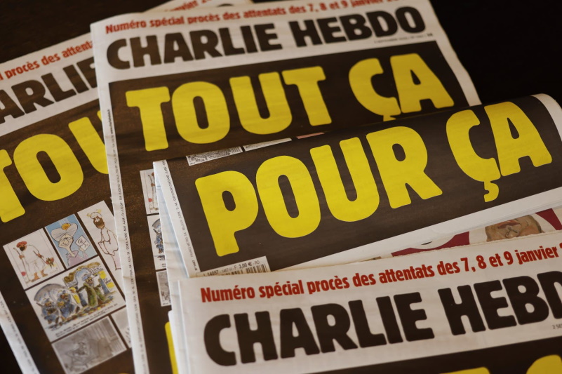 همزمان با برگزاری دادگاه متهمان کشتار در نشریهی شارلی ابدواین نشریه بار دیگر در حمایت از کشته شدگان در صفحه یک خود تصاویر کاریکاتورهای توهین آمیز به پیامبر اسلام را بازنشر کردر که باردیگر واکنشهای منفی بسیار زیادی را برانگیخت. چندی پیش در سفر امانوئل مکرون به بیروت، خبرنگاری از رئیس جمهور فرانسه پرسید چرا اهانت شارلی ابدو به پیامبر اسلام را محکوم نکردید او در جواب گفت فرانسه کشوری آزاد و دارای حق آزادی بیان است و در ادامه همان خبرنگار پرسید چرا انکار هلوکاست زندان و محرومیت در پی دارد اما او سکوت کرد. رفتار مکرون درباره این موضوع نیز واکنش های زیادی در پی داشت.
