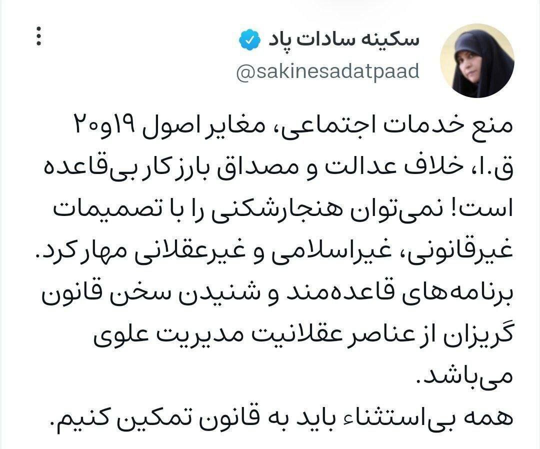 - سکینه سادات پاد، دستیار رئیس جمهور در پیگیری حقوق و آزادی های اجتماعی نوشت: