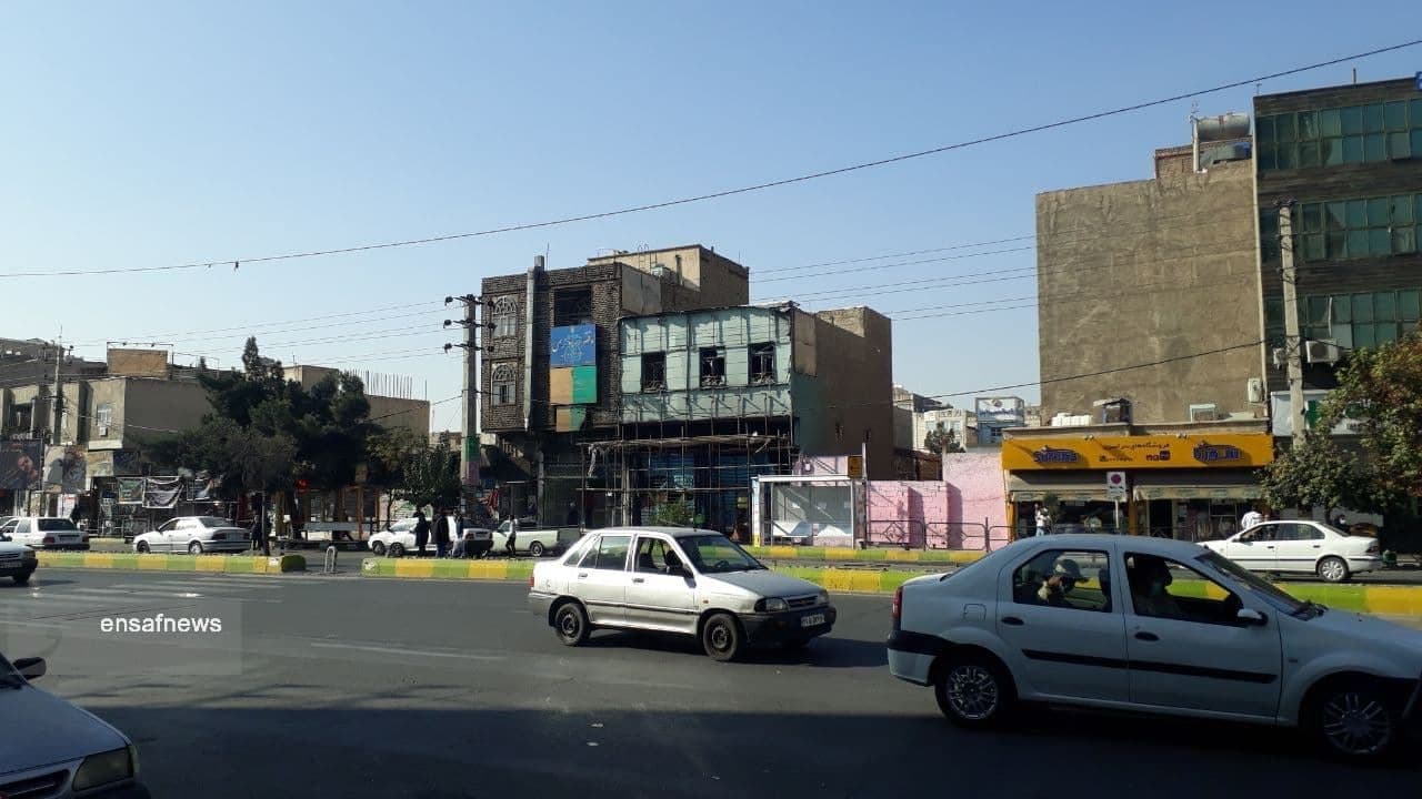 خبرنگاران از مغازه گل فروشی بیرون آمدند و بعد از طی چهارراه، به ضلع مقابل آن یعنی جنوب غرب رفتند. محسن به آن ضلع شمال غرب چهار راه اشاره کرد و گفت در آنجا یک ساختمان فرسوده و آتش گرفته شده را میبینید که متعلق به بانک رسالت است. [عکس ابتدای گزارش]