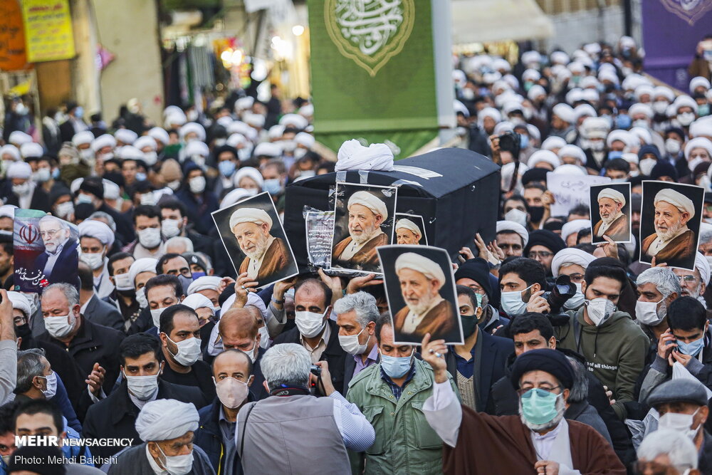 عکسهای منتشرشده در خبرگزاریهای فارس، تسنیم، مهر و ایسنا از مراسم تشییع آیتالله محمد یزدی، رئیس جامعه مدرسین حوزه علمیه که بدون رعایت پروتکلهای بهداشتی برگزار شده را میبینید: