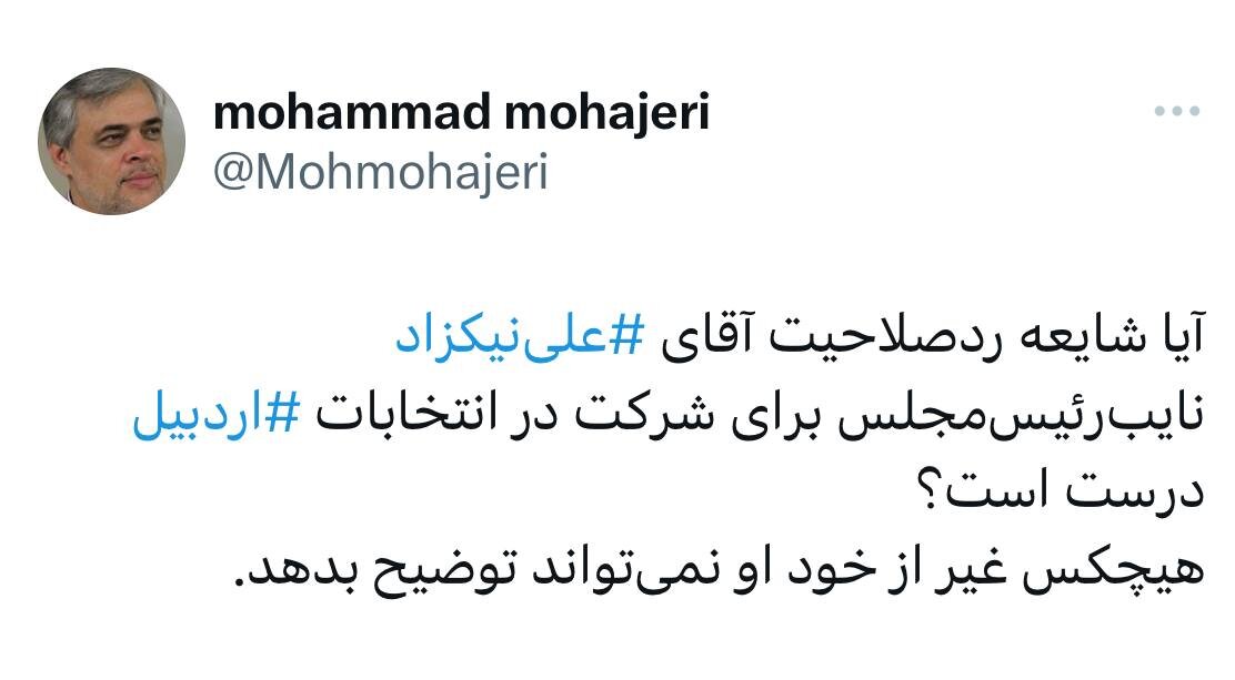 فعال اصولگرا نوشت: آیا شایعه ردصلاحیت آقای علینیکزاد نایبرئیسمجلس برای شرکت در انتخابات اردبیل درست است؟