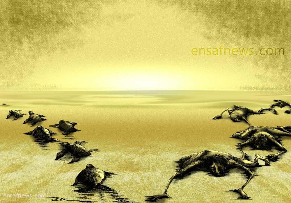کارتون از انصاف نیوز، «بنیامین آل علی»، با موضوع جغرافیای پناهجویان. انتهای پیام