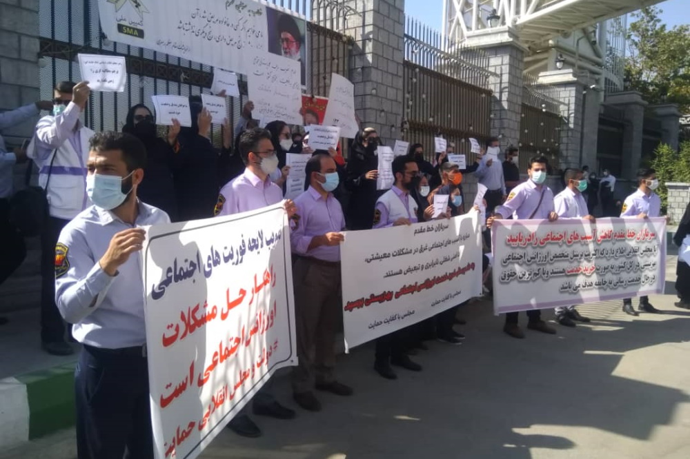این تجمع امروز، ۱۱ مهرماه در اعتراض به وضعیت صنفی کارکنان اورژانس اجتماعی برگزار شد.