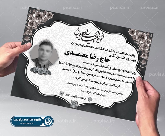 شما می توانید تمامی ویژگی های آگهی ترحیم مورد نظرتان را با سلیقه خودتان انتخاب کنید، متخصصان و طراحان حرفه ای گروه پاویسا در کوتاهترین زمان ممکن به سفارش شما رسیدگی میکنند و آن را در اسرع وقت برای شما ارسال می کنند. از طرفی دیگر توجه داشته باشید که شما می توانید آگهی ترحیم و بنر تسلیت را در قالب های PSD و لایه باز دریافت نمایید و آن را برای تمامی اشخاصی که می خواهید به صورت اینترنتی ارسال نمایید.
