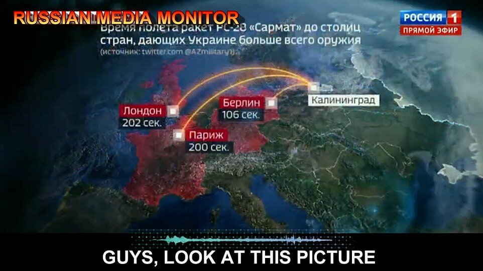 در یکی از پربینندهترین برنامههای تلویزیون روسیه نحوه حمله اتمی پوتین به سه شهر لندن، پاریس و برلین در زیر ۴ دقیقه شبیه سازی شده و تاکید شد هیچ کس زنده در این سه شهر زنده نخواهد ماند.