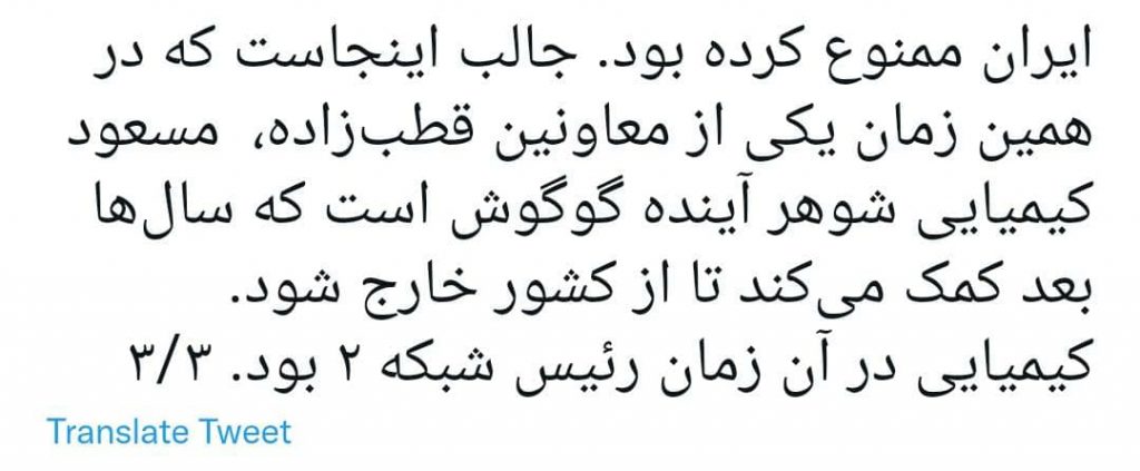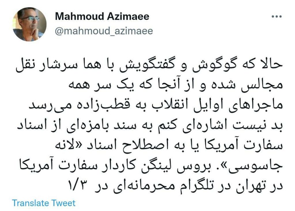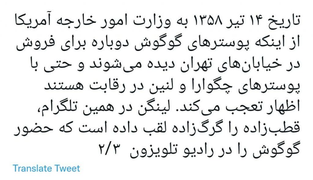 محمود عظیمایی پژوهشگر تاریخی طی یادداشتی در توییتر خود نوشت: حالا که گوگوش و گفتگویش با هما سرشار نقل مجالس شده و از آنجا که یک سر همه ماجراهای اوایل انقلاب به قطبزاده میرسد بد نیست اشارهای کنم به سند بامزهای از اسناد سفارت آمریکا یا به اصطلاح اسناد «لانه جاسوسی». بروس لینگن کاردار سفارت آمریکا در تهران در تلگرام محرمانهای در تاریخ ۱۴ تیر ۱۳۵۸ به وزارت امور خارجه آمریکا از اینکه پوسترهای گوگوش دوباره برای فروش در خیابانهای تهران دیده میشوند و حتی با پوسترهای چگوارا و لنین در رقابت هستند اظهار تعجب میکند. لینگن در همین تلگرام، قطبزاده را گرگزاده لقب داده است که حضور گوگوش را در رادیو تلویزون ایران ممنوع کرده بود. جالب اینجاست که در همین زمان یکی از معاونین قطبزاده، مسعود کیمیایی شوهر آینده گوگوش است که سالها بعد کمک میکند تا از کشور خارج شود. کیمیایی در آن زمان رئیس شبکه ۲ بود.