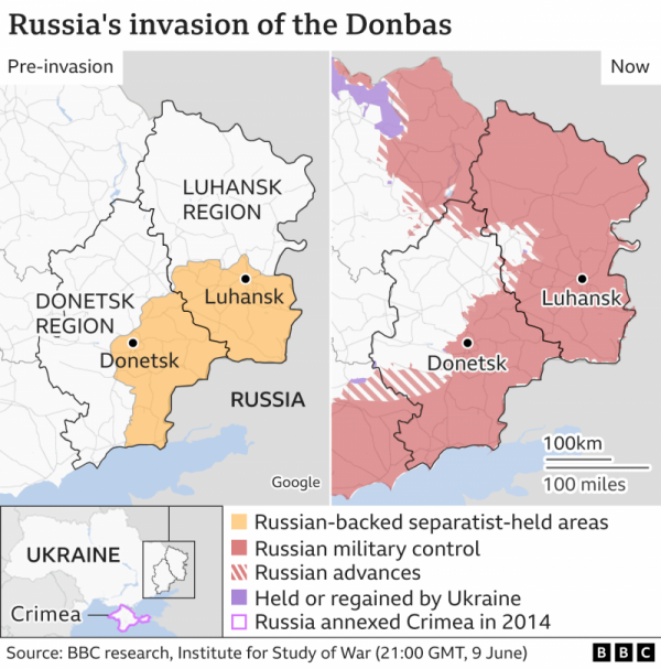 به گفته مقامات اوکراینی، نبرد برای شهر سورودونتسک همچنان ادامه دارد. ولودیمیر زلنسکی، رئیسجمهور اوکراین میگوید که نیروهای این کشور شهرهای مهم خط مقدم در دونباس، یعنی سورودونتسک و لیسیچانسک را «نگهدارند». در اینجا آخرین تحولات آمده است: سورودونتسک: به گفته مقامات اوکراینی، درگیری های خیابانی در شرق شهر ادامه دارد و هیچ تغییر عمده ای در روز گذشته گزارش نشده است. رئیس اداره نظامی منطقه سورودونتسک گفت که وضعیت "بسیار متشنج" است. شیوع احتمالی وبا: بر اساس گزارش اطلاعاتی بریتانیا که روز جمعه منتشر شد، شهر ماریوپول در معرض خطر شیوع گسترده وبا قرار دارد زیرا روسیه در حال تلاش برای ارائه خدمات اولیه در بحبوحه وخامت شرایط بهداشتی در این شهر است. بر اساس این گزارش، خرسون همچنین «احتمالاً با کمبود شدید دارو مواجه است». محکومیت احکام اعدام: رهبران جهان از دادگاه طرفدار روسیه در جمهوری خودخوانده مردم دونتسک به دلیل محکومیت سه مرد - یک شهروند مراکشی و دو شهروند بریتانیایی - در روز پنجشنبه پس از متهم شدن آنها به "مزدور" برای اوکراین انتقاد کردند. . سازمان ملل گفت که از احکام اعدام "نگران" است، در حالی که دولتهای اوکراین و بریتانیا خواستار آن هستند که تحت کنوانسیون ژنو به عنوان اسیر جنگی تحت درمان قرار گیرند. "پیتر کبیر": ولادیمیر پوتین، رئیس جمهور روسیه، خود را به خوبی با پیتر کبیر، پادشاه روسیه از اواخر قرن هفدهم مقایسه کرد. پوتین با فتح سوئد توسط پیتر کبیر تشابهاتی را ترسیم کرد - گفت که پادشاه در حال فتح نبود، بلکه بر سر سرزمین هایی که حقاً به روسیه تعلق داشت می جنگید - تا تهاجم کنونی به اوکراین را توجیه کند. آتش دائمی: شهر کریویی ریح واقع در بخش مرکزی اوکراین زیر آتش مداوم نیروهای روسی قرار گرفته است. روستاها و شهرهای این منطقه «به دلیل گلوله باران مملو از مهمات خوشهای هستند» که ردی از مشکلات تامین گاز، برق و آب را نیز بر جای میگذارد. اوکراین پوتین را تحریم کرد: ولودیمیر زلنسکی، رئیسجمهور اوکراین روز پنجشنبه فرمانی را امضا کرد که بر اساس آن، ولادیمیر پوتین، رئیسجمهور روسیه و دیگر مقامات بلندپایه تحریمهای شخصی اعمال میشود. این محدودیت ها شامل مسدود کردن دارایی ها، ممنوعیت ورود به اوکراین و لغو یا تعلیق مجوزها و مجوزها است. تاراس ویسوتسکی، معاون وزیر سیاست کشاورزی و غذای اوکراین، پنجشنبه به سیانان گفت: برداشت کاهش یافته: برداشت سال آینده در اوکراین ممکن است تا ۴۰ درصد به دلیل تهاجم مداوم روسیه کاهش یابد