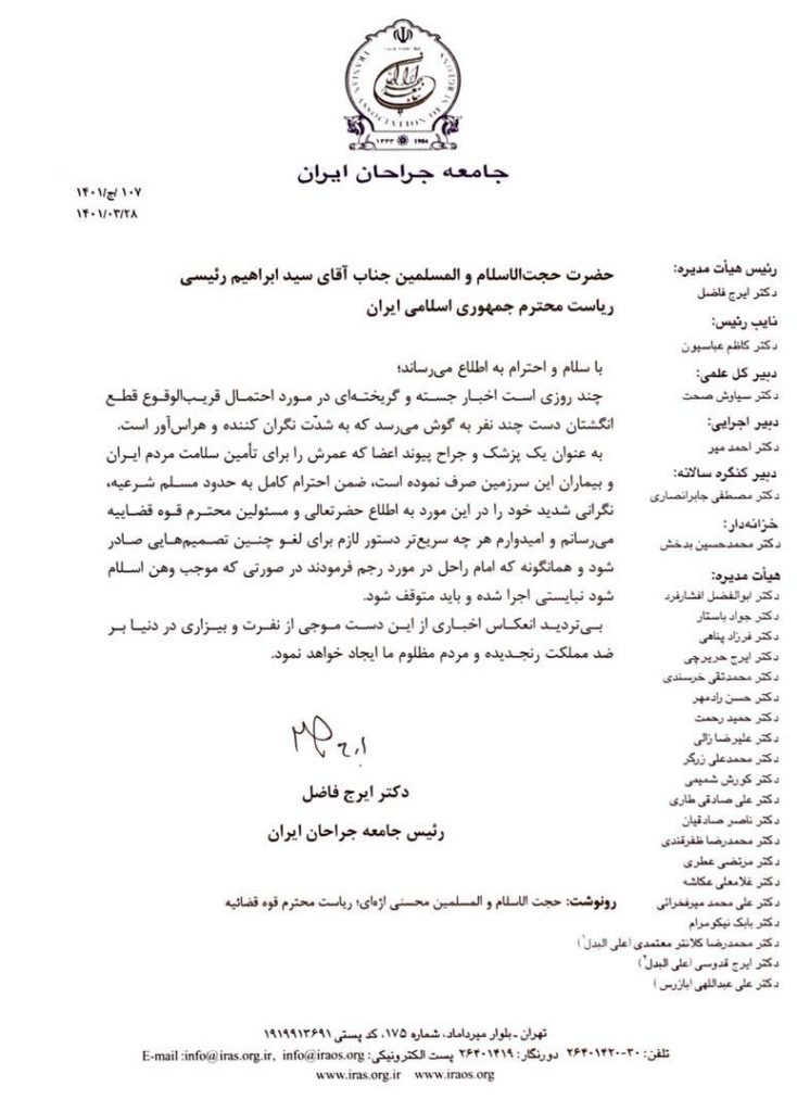 به عنوان یک پزشک و جراح پیوند اعضا که عمرش را برای تامین سلامت مردم ایران و بیماران این سرزمین صرف نموده است، ضمن احترام کامل به حدود مسلم شرعیه، نگرانی خود را در این مورد به اطلاع حضرتعالی و مسئولین محترم قوه قضاییه می رسانم و امیدوارم هرچه سریع تر دستور لازم برای لغو چنین تصمیم هایی صادر شود و همانگونه که امام راحل در مورد رجم فرمودند در صورتی که موجب وهن اسلام شود نبایستی اجرا شده و باید متوقف شود.