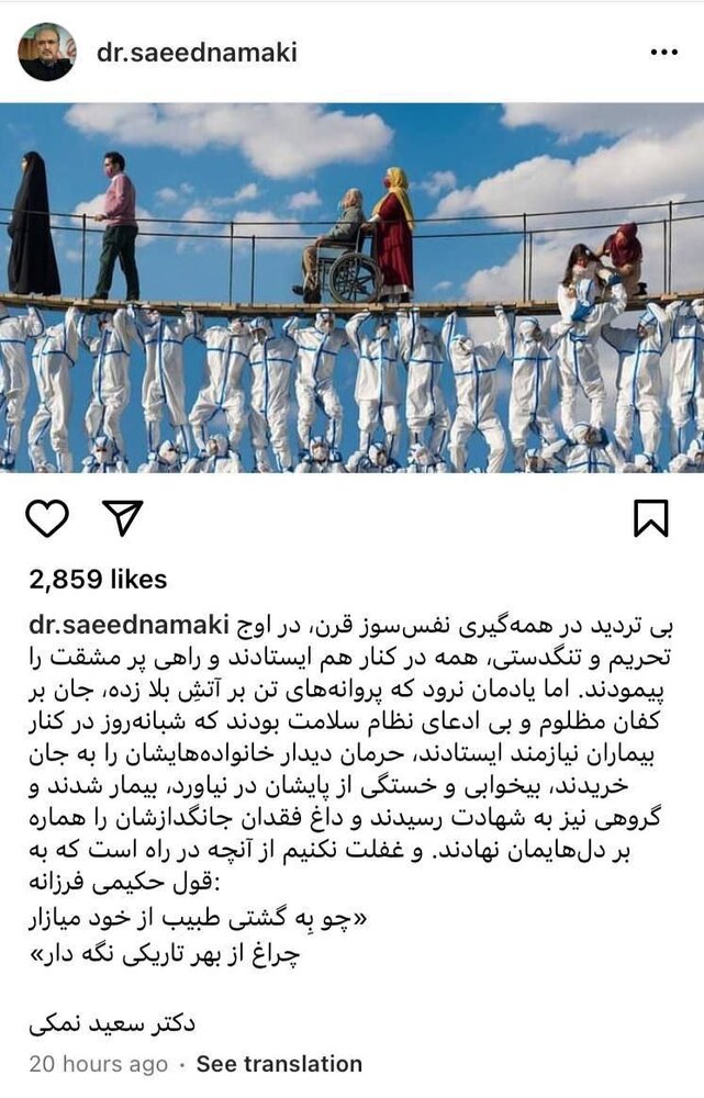 به گزارش مردم سالاری آنلاین، سعید نمکی وزیر سابق بهداشت در واکنش به اظهارات رئیس دولت سیزده در صفحه مجازی خود نوشت: بی تردید در همه گیری نفس سوز قرن، در اوج تحریم و تنگدستی، همه در کنار هم ایستادند و راهی پر مشقت را پیمودند. اما یادمان نرود نرود که پروانههای تن بر آتش بلا زده، جان بر کفان مظلوم و بی ادعا نظام سلامت بودند که شبانه روز در کنار بیماران نیازمند ایستادند، حرمان دیدار خانواده هایشان را به جان خریدند، بیخوابی و خستگی از پایشان در نیاورد، بیمار شدند و گروهی نیز به شهادت رسیدند و داغ فقدان جانگدازشان را همواره بر دل هایمان نهادند، و غفلت نکنیم از آنچه در راه است که به قول حکیمی فرزانه «چو به گشتی طبیب از خود میازار چراغ از بهر تاریکی نگه دار»