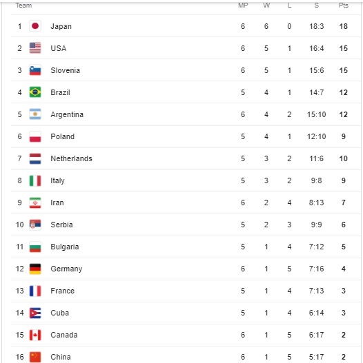 تیم ملی والیبال ایران نیز با شکست برابر ایتالیا به رتبه ۹ جدول سقوط کرد تا همچنان شرایط برای صعود به دور نهایی برای عطایی و شاگردان پیچیده باشد.
