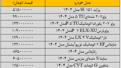 در این میان، قیمت پژو ۲۰۶ تیپ ۳ پانوراما مدل ۱۴۰۲ در حدود ۱۵ میلیون تومان ارزان شده و ۶۳۰ میلیون تومان قیمت خورده است. پژو ۲۰۷ دندهای مدل ۱۴۰۳ اما با کاهش ۲۰ میلیون تومانی، ۷۳۵ میلیون تومان به فروش رفت. این در حالی است که پژو ۲۰۷ پانوراما اتوماتیک TU۵P مدل ۱۴۰۳ در حدود ۱۵ میلیون تومان ارزان شد و یک میلیارد تومان به فروش رفت. پژو ۲۰۷ تیپ ۵ مدل ۱۴۰۲ نیز با کاهش ۱۵ میلیون تومانی، ۶۵۰ میلیون تومان قیمت پیدا کرد. اما پژوپارس ELX-TU۵ مدل ۱۴۰۲ با کاهش ۵ میلیون تومانی به قیمت ۷۹۵ میلیون تومان رسید. پژوپارس LX مدل ۱۴۰۲ هم بدون تغییر، ۸۳۰ میلیون تومان قیمت پیدا کرد.