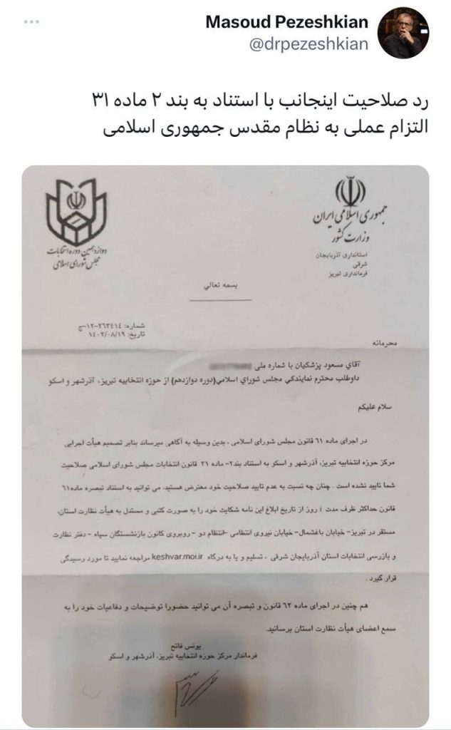 مسعود پزشکیان، درخصوص علت رد صلاحیت وی در انتخابات مجلس، در حساب توییتر خود نوشت: انتهای پیام