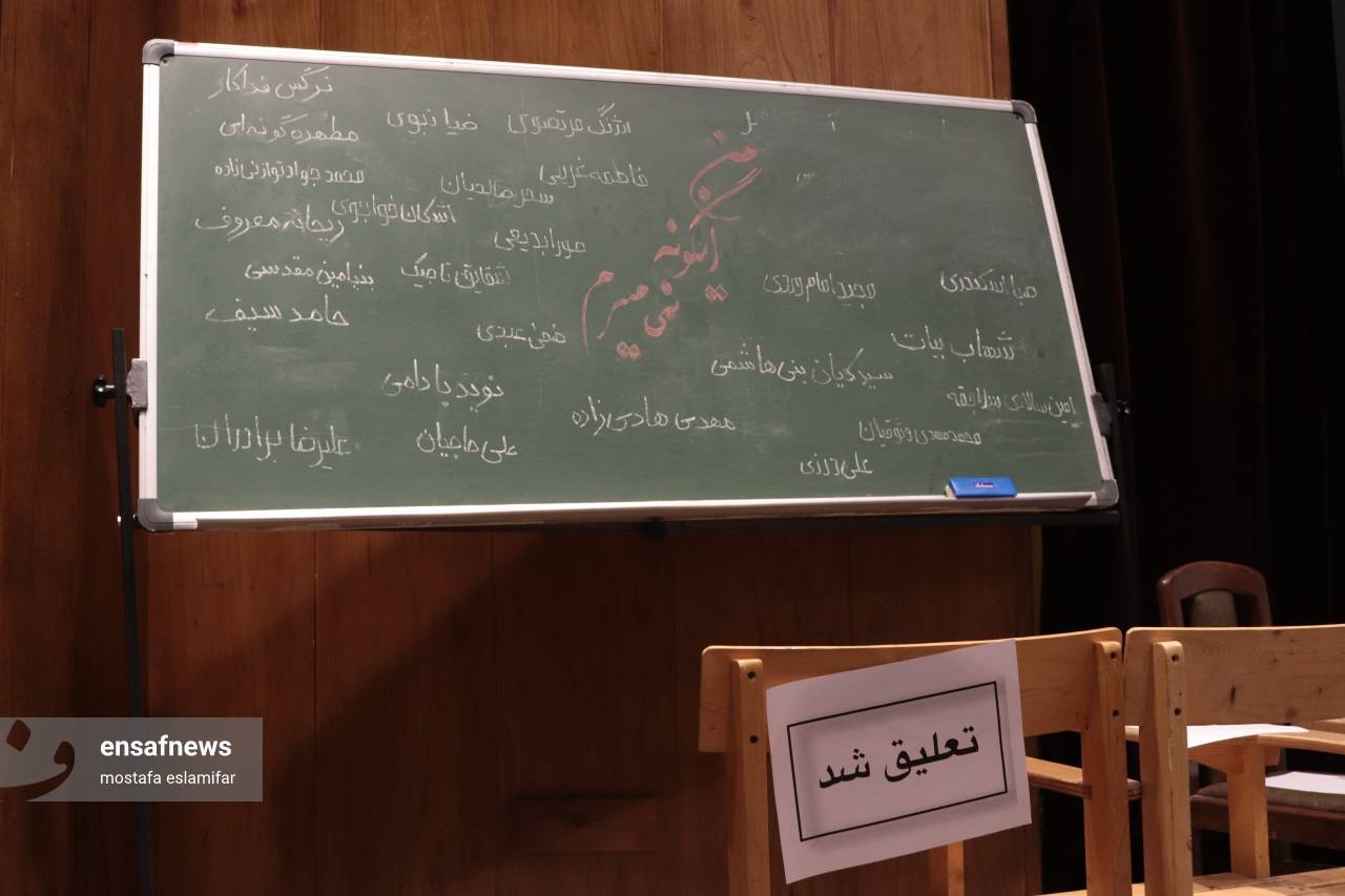 یکی از دانشجویان که زودتر از ما در سالن حاضر شده بود میگفت حراست دانشگاه نزدیک آغاز برنامه دکور را تغییر داده است. او از آنچه دیده بود حدس میزد که دانشگاه قبل از شروع برنامه فشار مضاعفی بر اعضا و عوامل این برنامه آورده است. بنابراین آنچه میدیدیم دکور دوم بود. روی سن چند صندلی پشت به سالن با کاغذنوشت «تعلیق شد» و تخته سبزی که بر آن اسامی دانشجویان اخراجی و تعلیقی مثل ضیا نبوی، مهدی هادیزاده، مطهره گونهای، فاطمه غریبی، کیان بنیهاشم و… همراهِ «من اینگونه نمیمیرم» خوانا و درشتی نوشته شده بود وجود داشت.