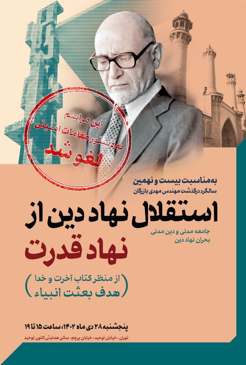 به گزارش انصاف نیوز، بر اساس اعلام ستاد برگزاری مراسم، «مراسم سالگرد مهندس بازرگان که قرار بود درباره کتاب «آخرت و خدا، هدف بعثت انبیاء» و با محوریت «استقلال نهاد دین از نهاد قدرت» برگزار شود» لغو شد.