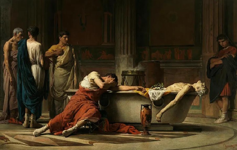 به گفتۀ سیاستمدار و مورّخِ شهیر «تاسیـتوس»(۲۶)، سنهکا مرگِ «سقراط» را الگویِ خود قرار داد؛ با دوستانش به گفتوگویی فلسفی پرداخت و آنها را بهعلّتِ فورانِ عواطف و احساساتشان سرزنش کرد. او رگش را زد، سپس رگ دیگری را برید و بعد چند رگ دیگر را، اما خونریزی به اندازهای نبود که سبب مرگش شود. حالا با احساسِ دردی شدید، مقداری «شوکران» نوشید، اما این سم نیز کارگر نشد. سرانجام برای فراخیِ رگها و کاهش درد، سنهکا خود را در آب گرم غوطهور ساخت و سرانجام بر اثرِ خفگی مُرد.