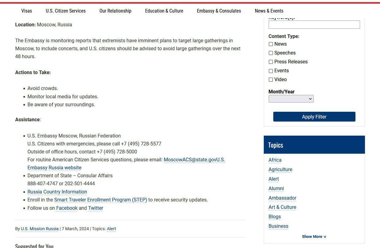 همچنین سفارت آمریکا مدتی قبل به شهروندانش هشدار داده بود که افراطگرایان برنامههای قریبالوقوعی برای هدف قرار دادن تجمعات بزرگ مانند کنسرتها در مسکو را دارند و از شهروندان آمریکایی خواسته بود تا ظرف ۴۸ ساعت آینده از حضور در چنین مکانهایی خودداری کنند.