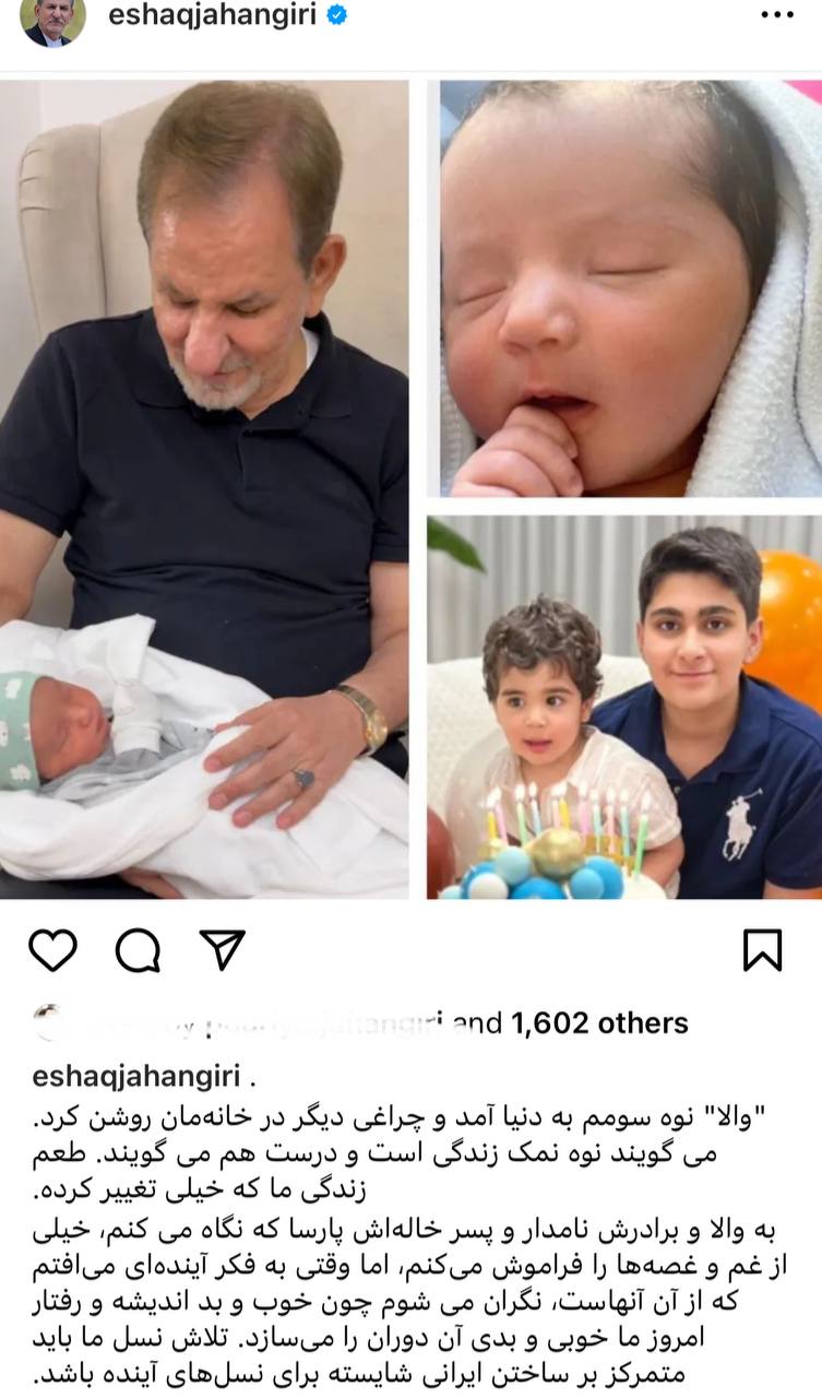 پست اسحاق جهانگیری از تولد سومین نوهاش