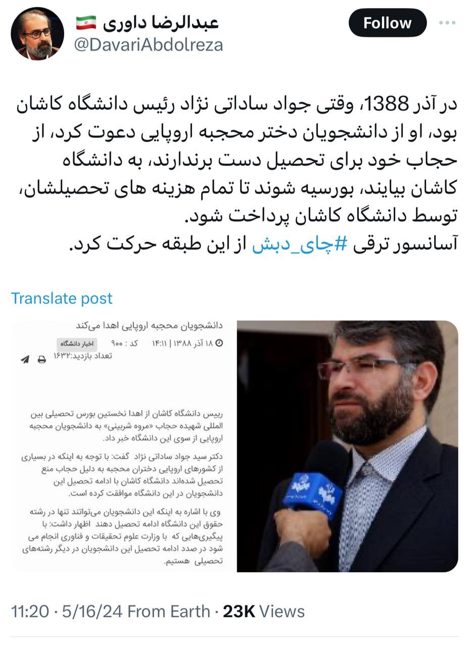 به گزارش خبرگزاری خبرآنلاین، عبدالرضا داوری فعال رسانهای و مشاور سابق محمود احمدینژاد، با بازنشر بخشی از سخنان جواد ساداتی نژاد در سال ۱۳۸۸ زمانیکه رئیس دانشگاه کاشان بود، در شبکه اجتماعی ایکس نوشت: