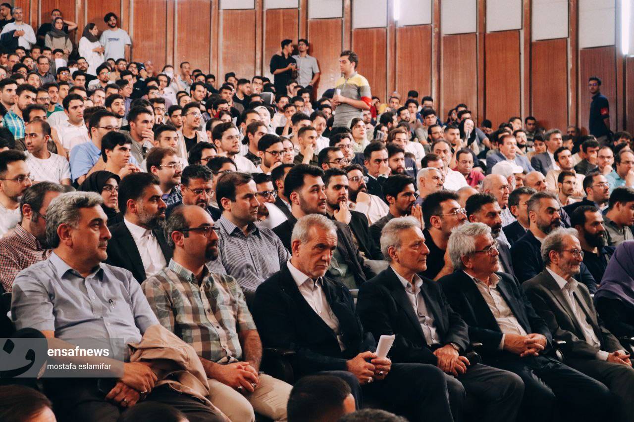 اولین جملهی سخنران این بود که انجمن اسلامی میزبان یک پرسش و پاسخ است نه یک نشست تبلیغاتی برای حمایت از نامزدی خاص. در کنار پزشکیان حضور چهرههایی نظیر محمود نیلی احمدآبادی و علیاصغر خدایاری جالب توجه است. سخنران با تاکید میگفت: یاد گرفتهایم آبروی دانشگاه را برای هیچکس ارزانی نکنیم چرا که حرمت امامزاده به متولیان آن است نه مهمانان آن. حرفهای سخنران و نمایندگانی که سخن گفتند تند و بیلکنت از اعتراضات دی ۹۶ و آبان ۹۸ و ۱۴۰۱ بود. جمعیت با این یادآوریها به تحرک درمیآمد؛ شعار سر میداد و تشویق میکرد. سخنران با اشاره به حضور میرحسین موسوی در ۱۳ اسفند ۸۷ میگفت که او بیش از همه پای عهد خود با دانشگاه مانده است. فریاد «یاحسین میرحسین» جمعیت بلند شد.
